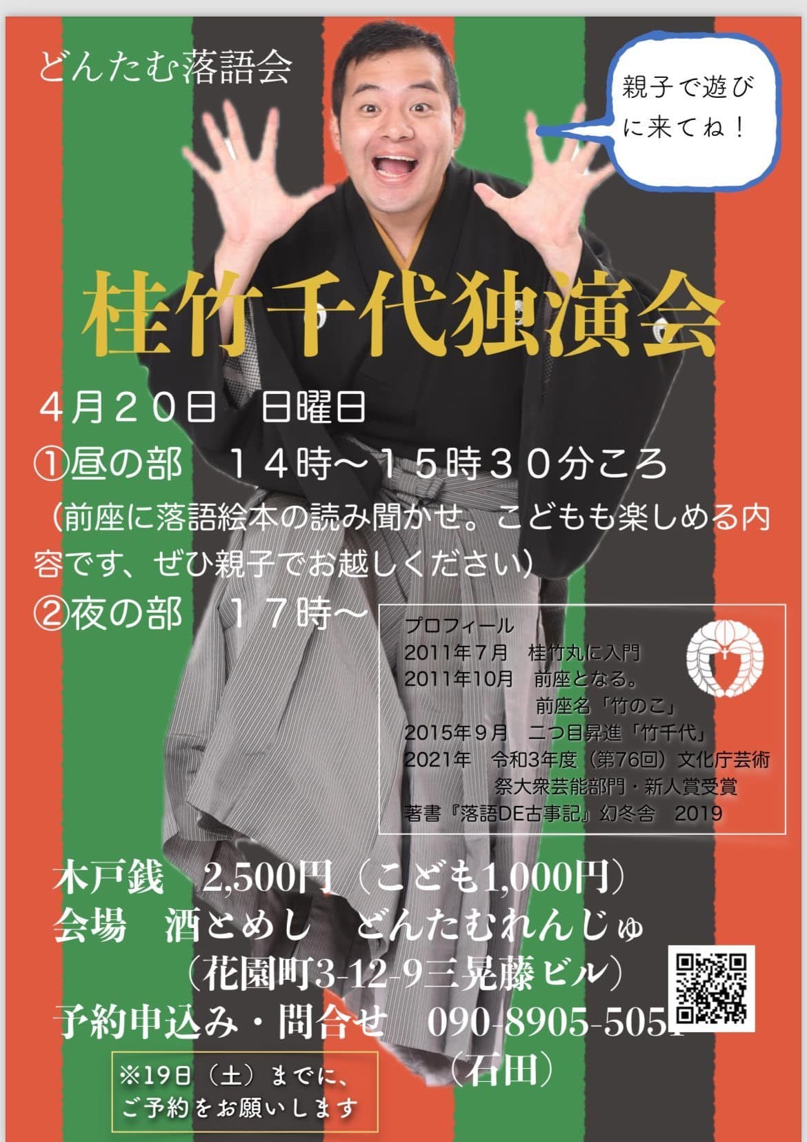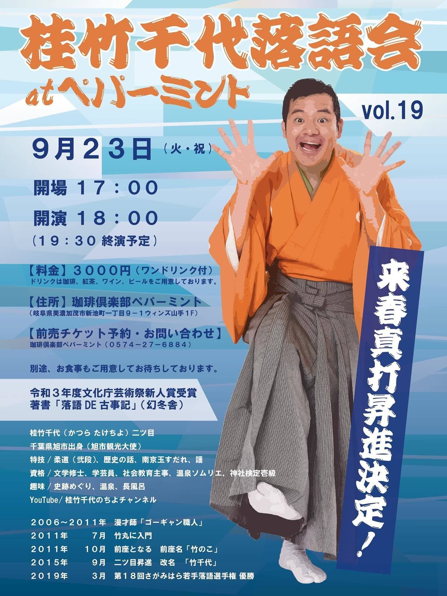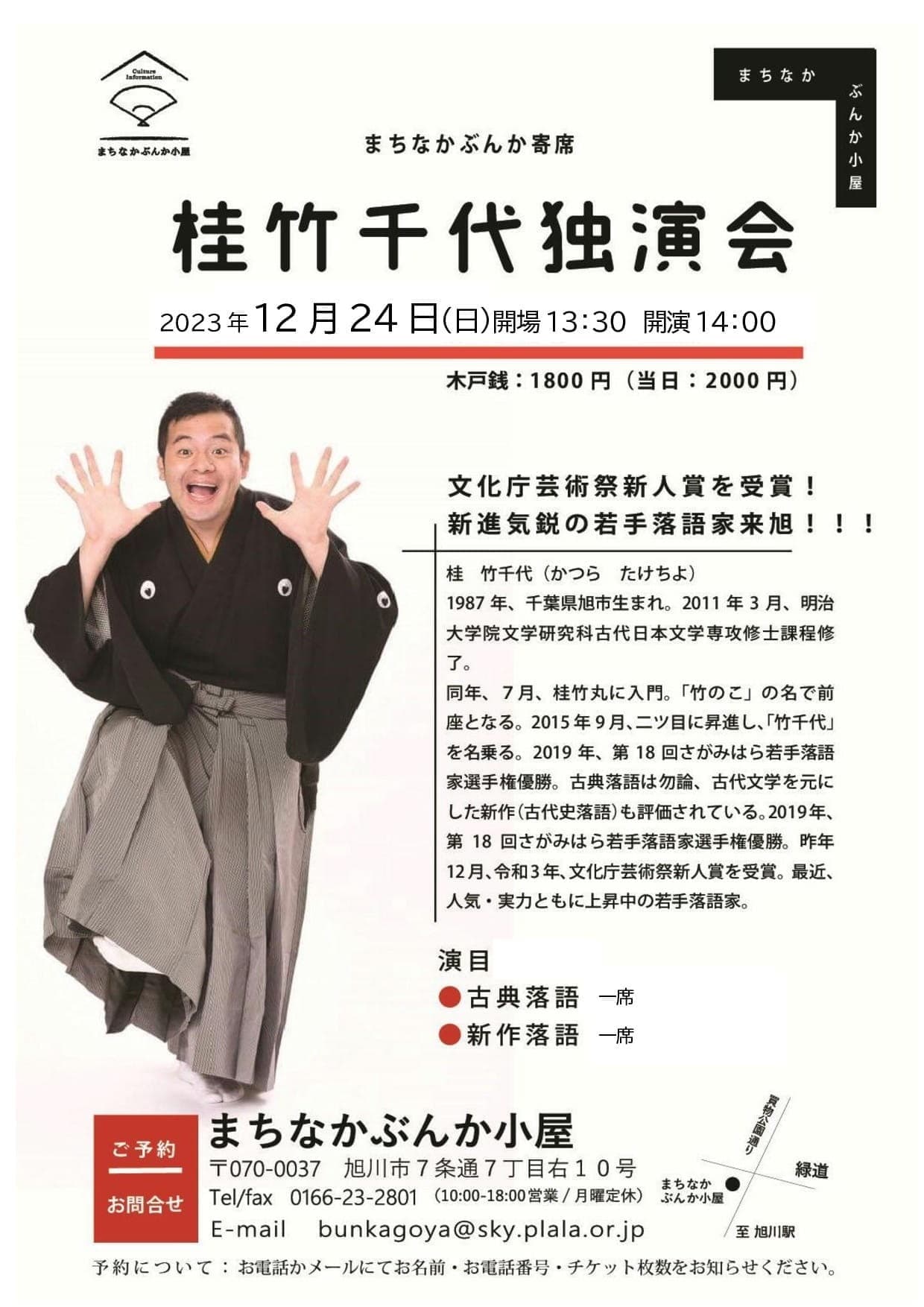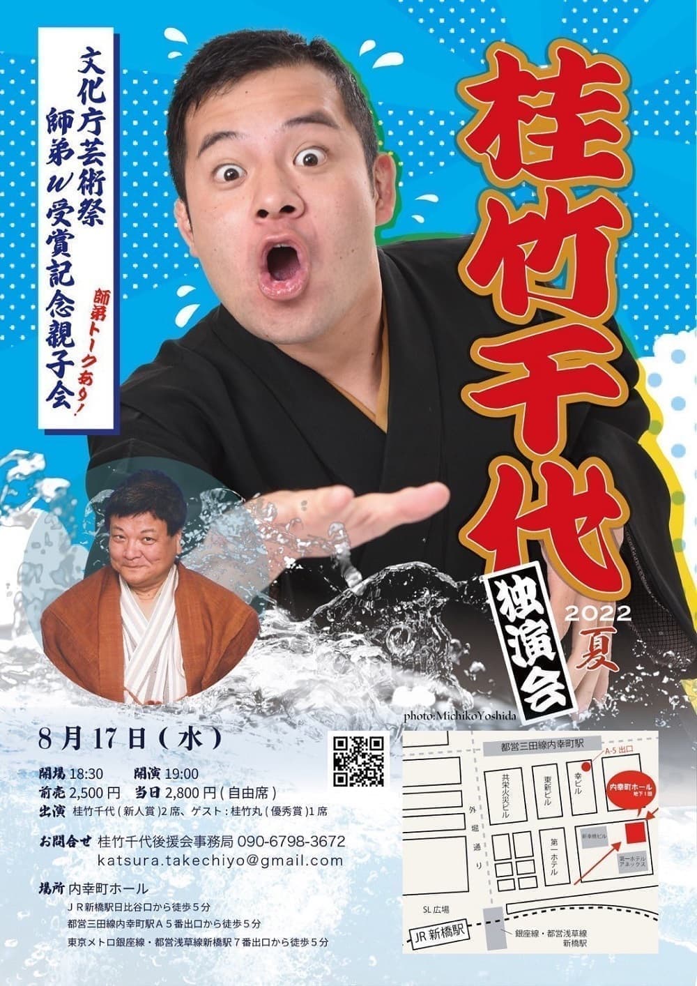 柔道(弐段)、文学修士、学芸員、社会教育主事、温泉ソムリエなどを所持している。千葉県旭市観光大使。同じ落語芸術協会に所属する二つ目10人(他のメンバーは、瀧川鯉津、春風亭昇吾、昔昔亭喜太郎、瀧川鯉白、三遊亭遊子、桂鷹治、古今亭今いち、立川幸之進、笑福亭希光)で「芸協カデンツァ」というユニットを組んでいる。実質的に「成金」の後継にあたる。2021年12月9日、ご当地落語「赤倉温泉」で、現地滞在4日間で創り演じた新作落語『おさいど祭』が、『湯守の宿三之丞賞』を受賞。2021年、令和3年度(第76回)文化庁芸術祭の大衆芸能部門新人賞を受賞。芸歴10周年を迎えた11月9日に、東京・内幸町ホールで開いた「桂竹千代独演会2021冬」(「鮑のし」「古事記~完全版」を口演)が評価された。(出典:ウィキペディア)