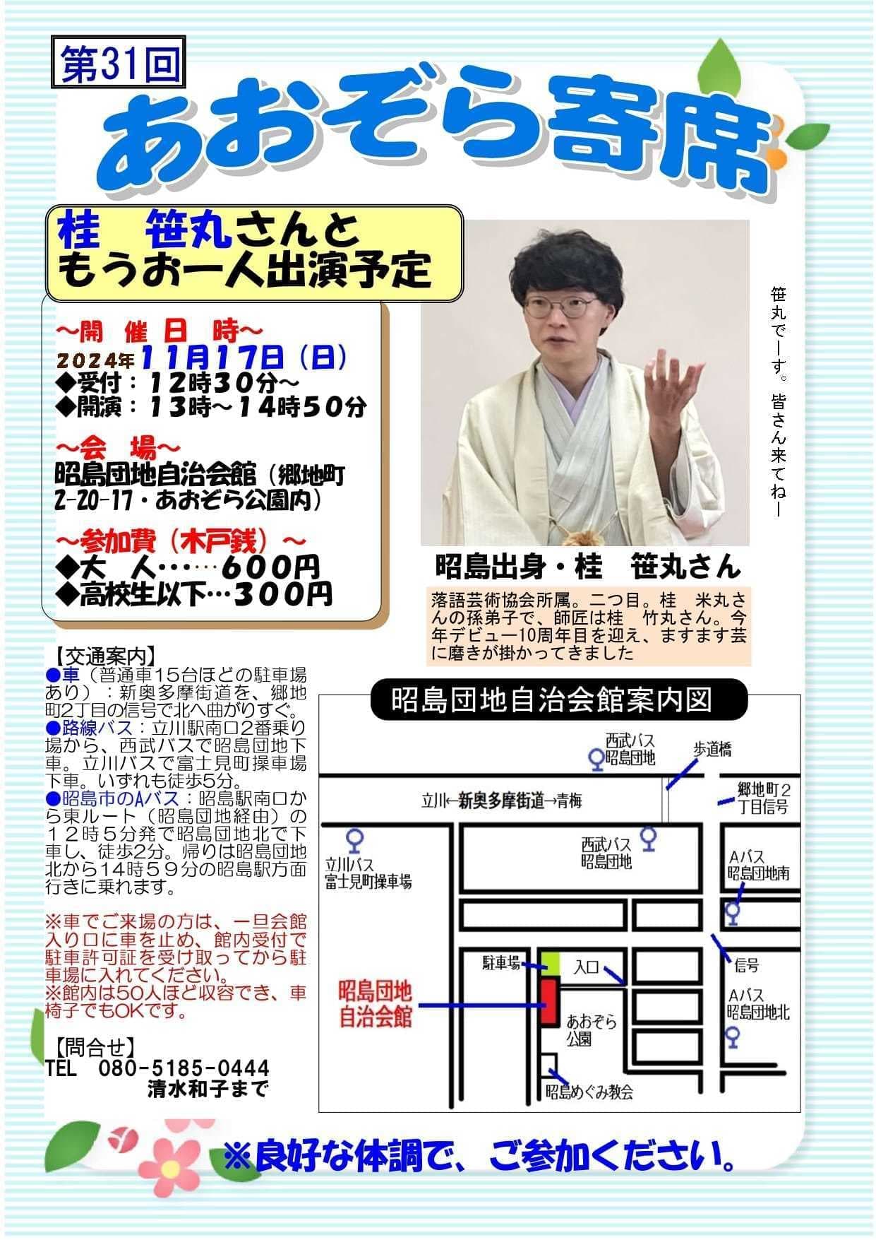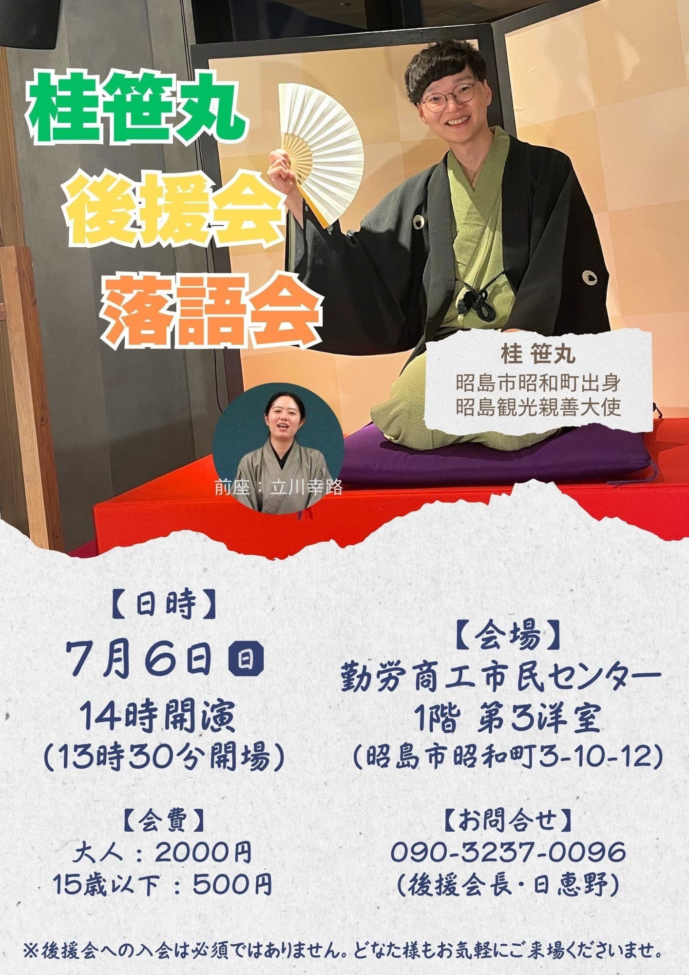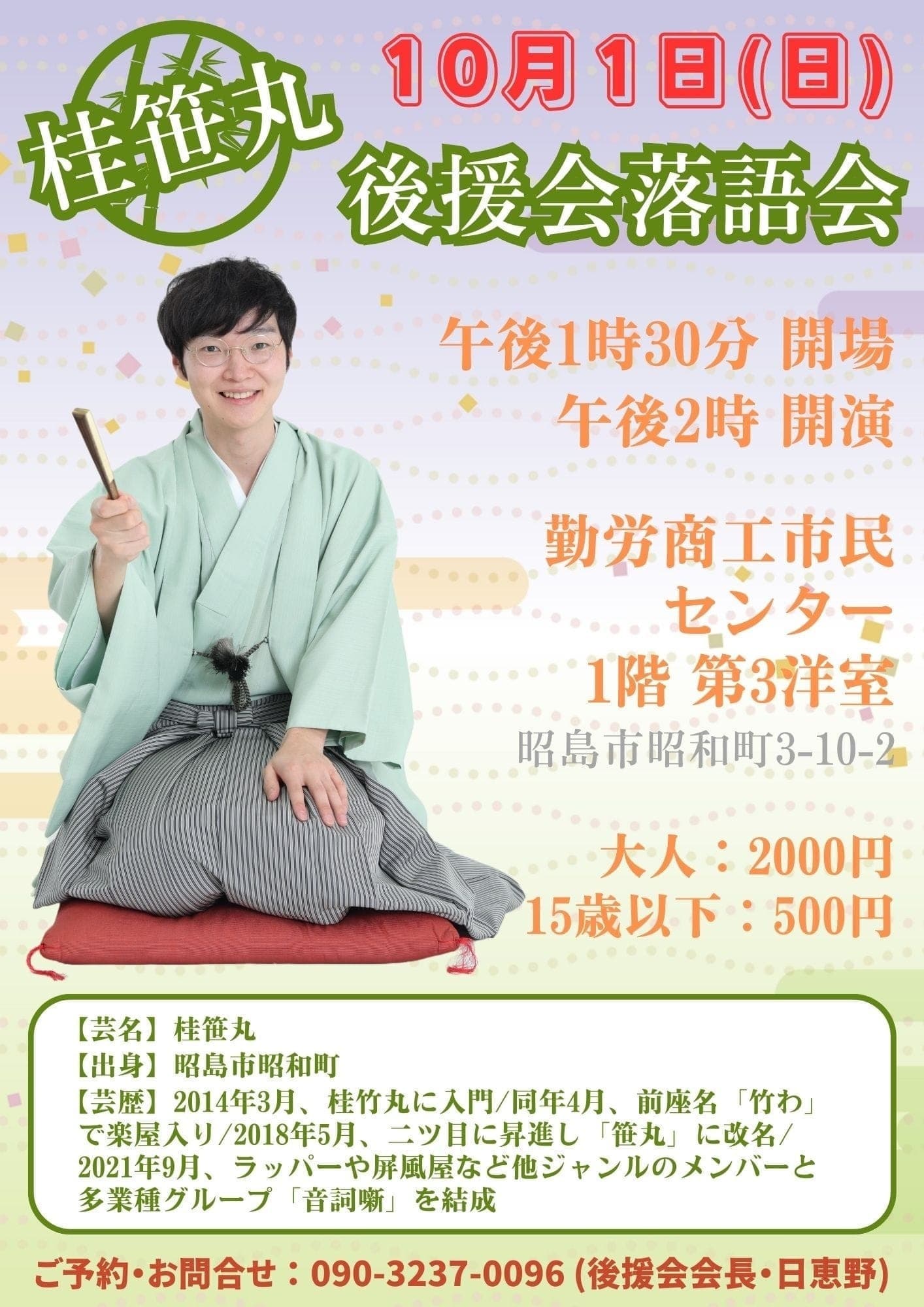 10月24日(月)19時から立川市のRISURUホールで師匠・竹丸との親子会やります!