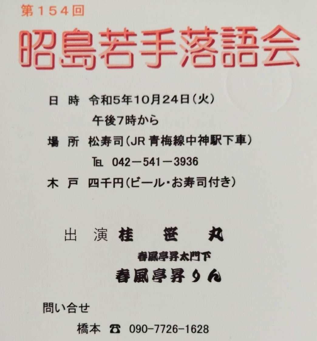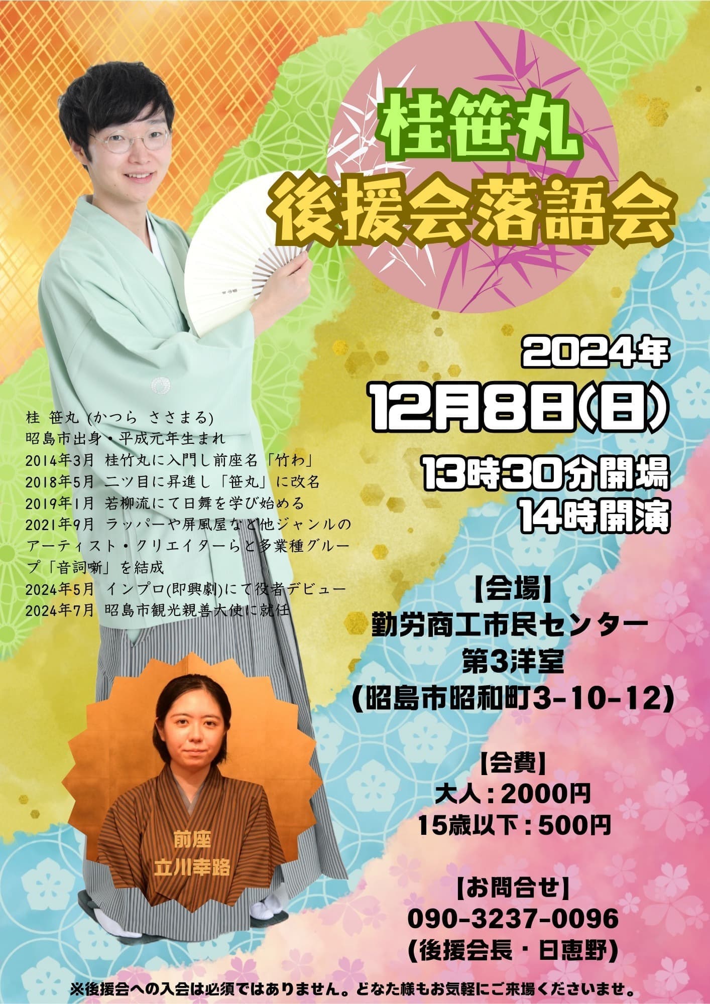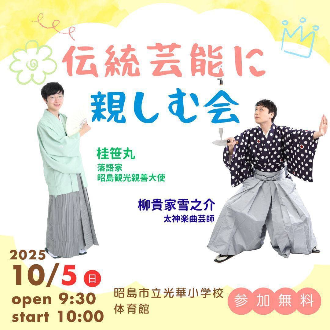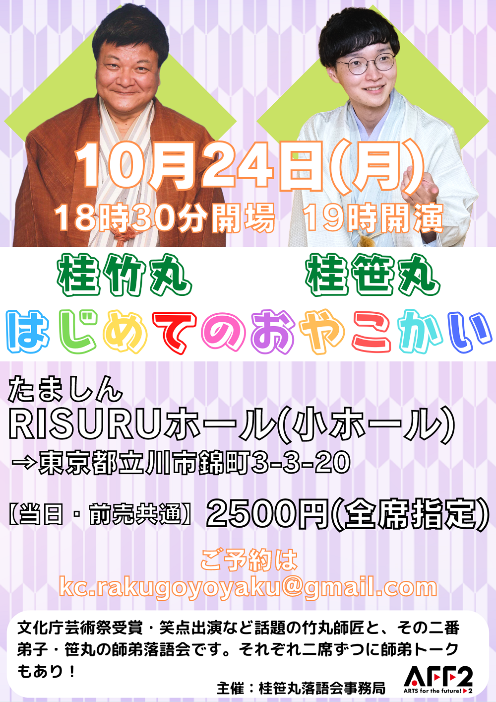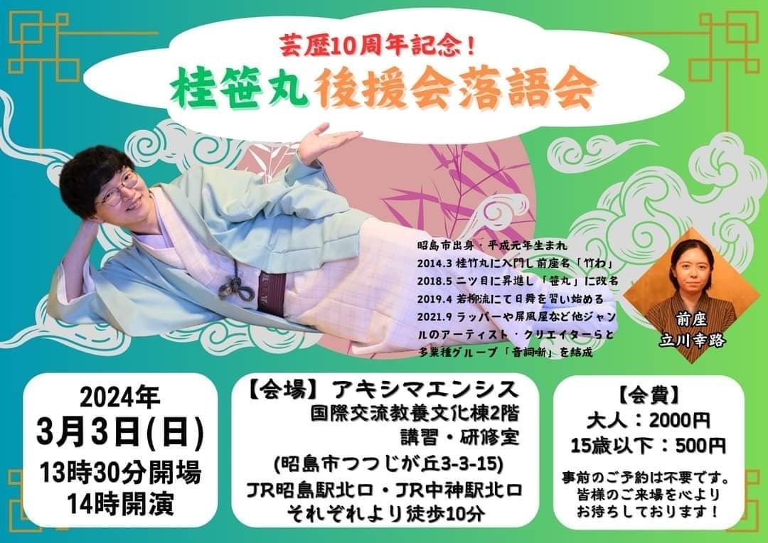 10月24日(月)19時から立川市のRISURUホールで師匠・竹丸との親子会やります!