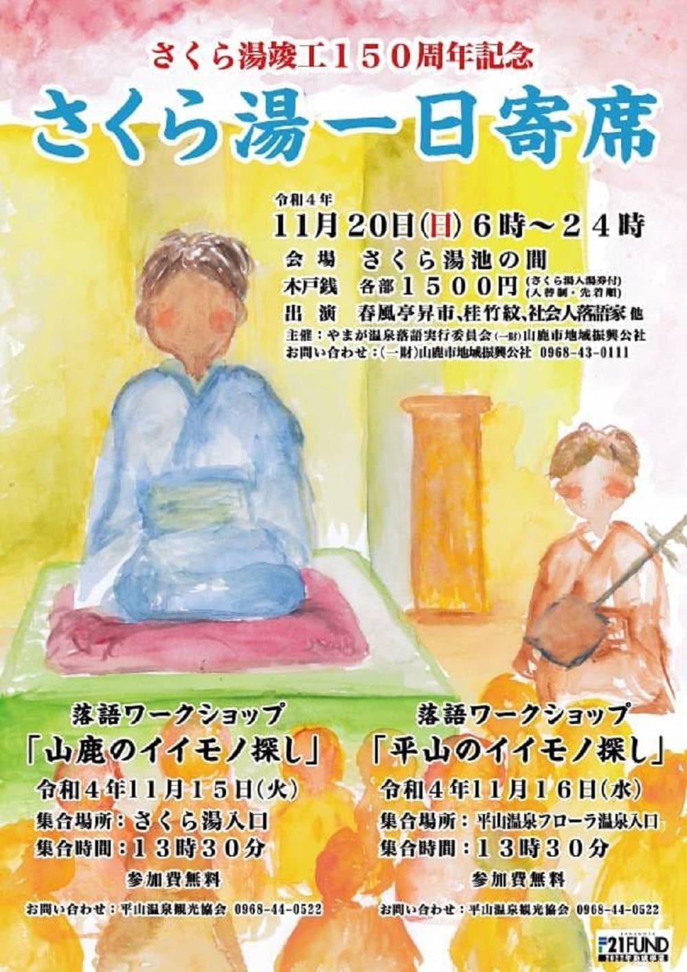 11月15日山鹿温泉・16日平山温泉界隈散策して、なぞかけや落語の見方等、ワークショップと落語付き会です。