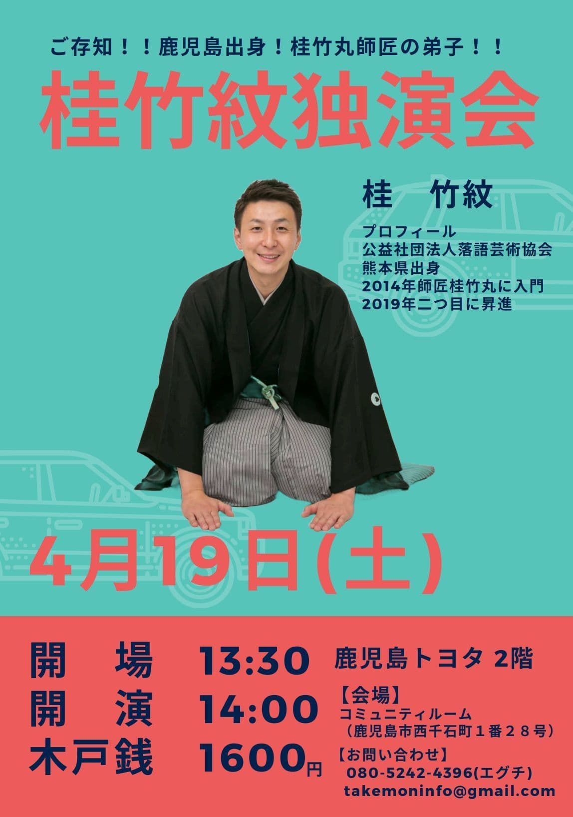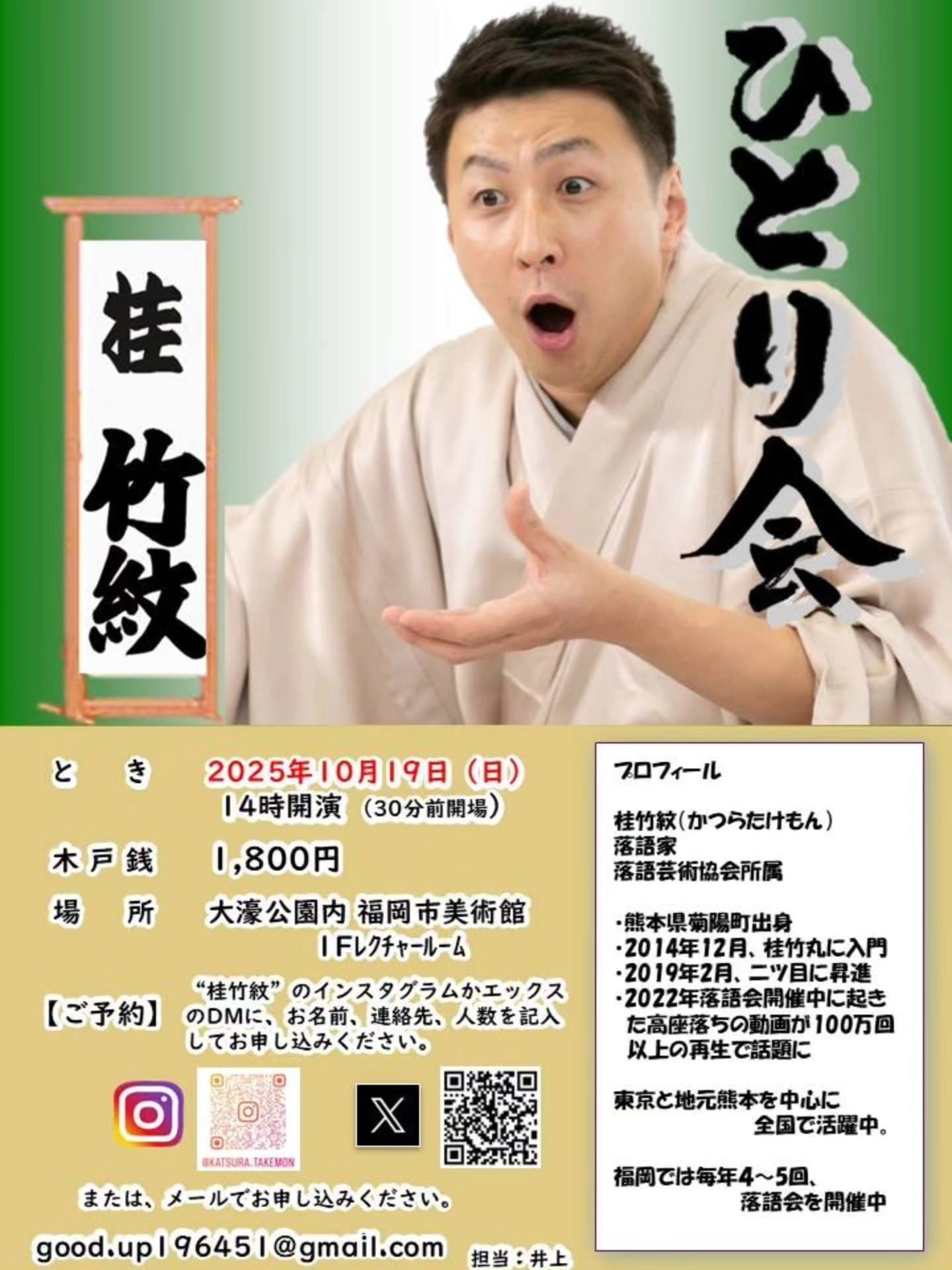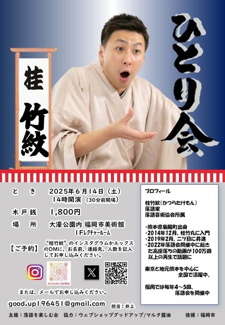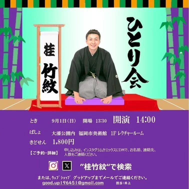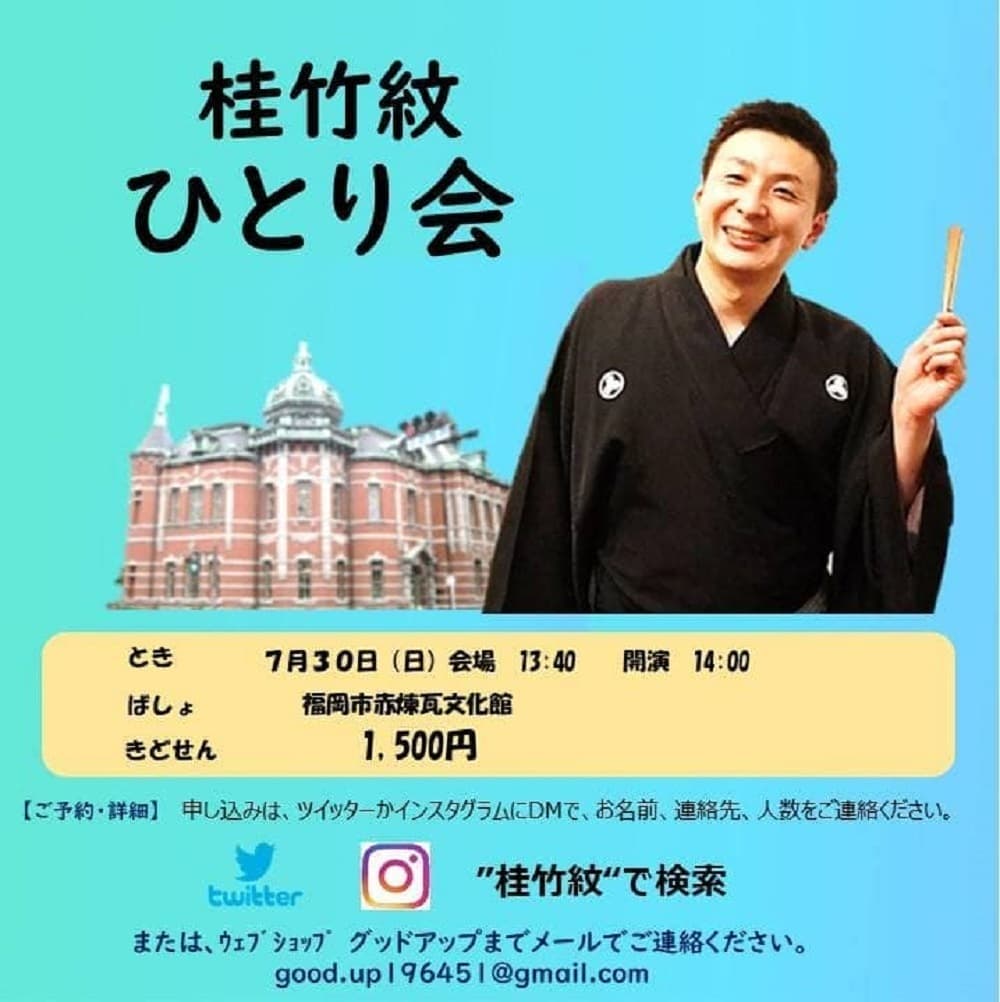 福岡で初めてひとり会をさせてもらいます!是非とも福岡の方々観に来て下さい。『桂竹紋ひとり会』8月26日(金)19時開演(30分前開場)