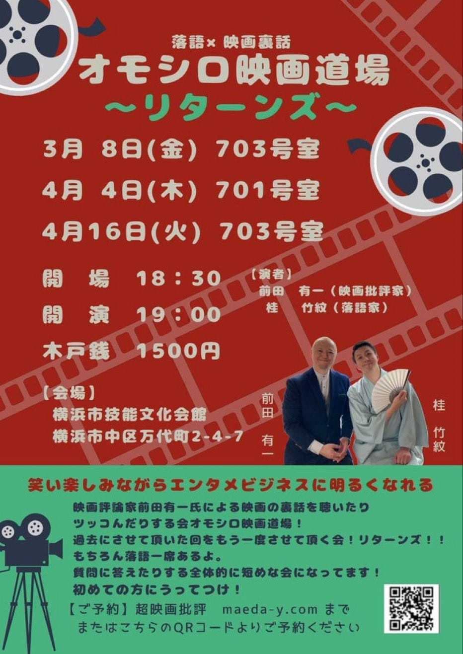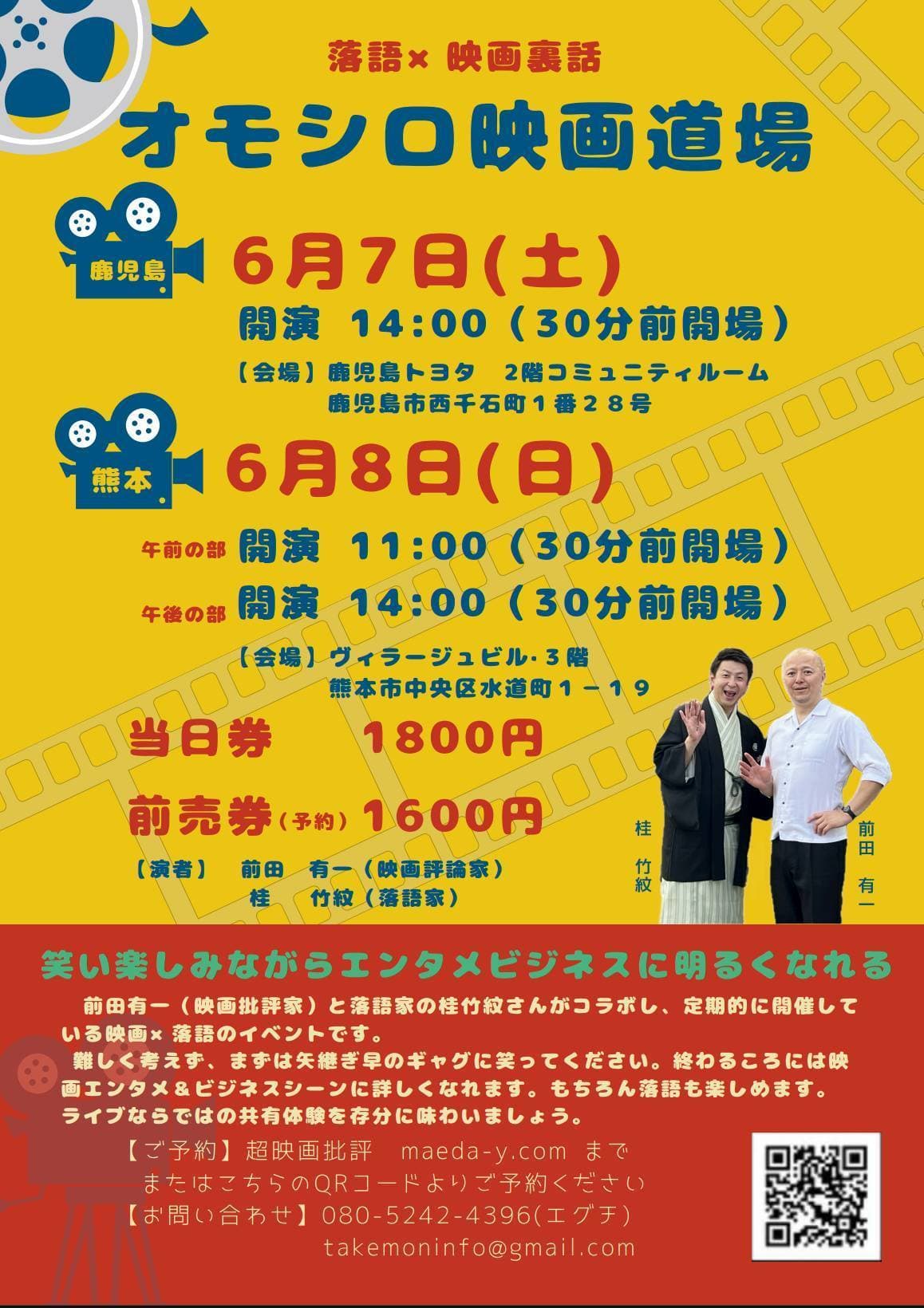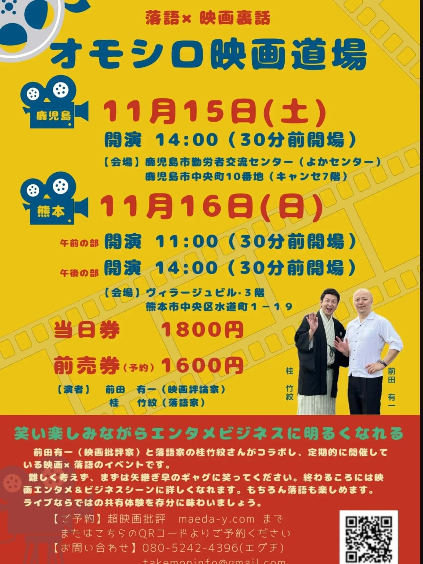 うちの師匠竹丸と鶴光師匠のトークショーもある落語会!是非とも観に来て下さい。八千代座ですから建物も素晴らしい!必見です