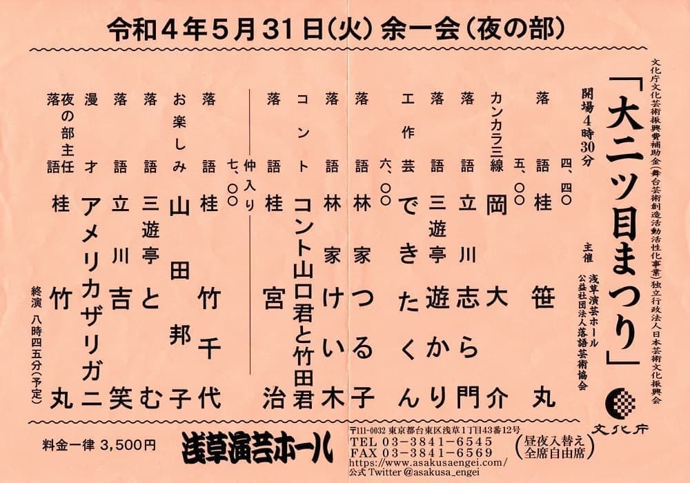 日時:2022年5月31日 16:30開場 16:40開演場所:浅草 演芸ホール 夜の部桂竹丸プロデユースの“大二ツ目祭り”は、落語芸術協会&落語協会&円楽一門&立川流の落語4団体の枠を超えた出演者の皆さんの熱演で浅草演芸ホールは大笑いの渦・うず・渦でした。
