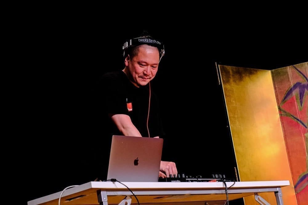 ⑤そしてMC曼荼羅さんのバックDJは片岡孝斗 この日のために音詞噺の屏風も作ってくれました。