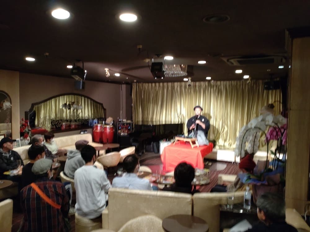 ②それ以外の出し物については、撮影禁止などを要求しない。従って、異業種の方々のパフォーマンスを少し撮影しました。*よって、落語の高座部分の撮影は有りません特筆すべきは、ⅯⅭ曼荼羅と言う名前で出演されている・・・のパフォーマンスが半端なく凄くて、会場の雰囲気を最高潮まで巻き込んでの熱演でした\(^o^)/今回は、’ちょっとだけよ’で画像を紹介します。電子講談:ヌーキーさん (以前、赤坂シルビーでも拝見)屛風屋: 片岡孝斗さんラッパー: 狐火 さん謎のラッパー:ⅯⅭ曼荼羅さん 最高でした 従って、ここの画像が殆どを〆るので、続報にてアップします。それでは、今回、来れなかったファンの皆さんゆっくりご覧ください。(児玉事務局長)