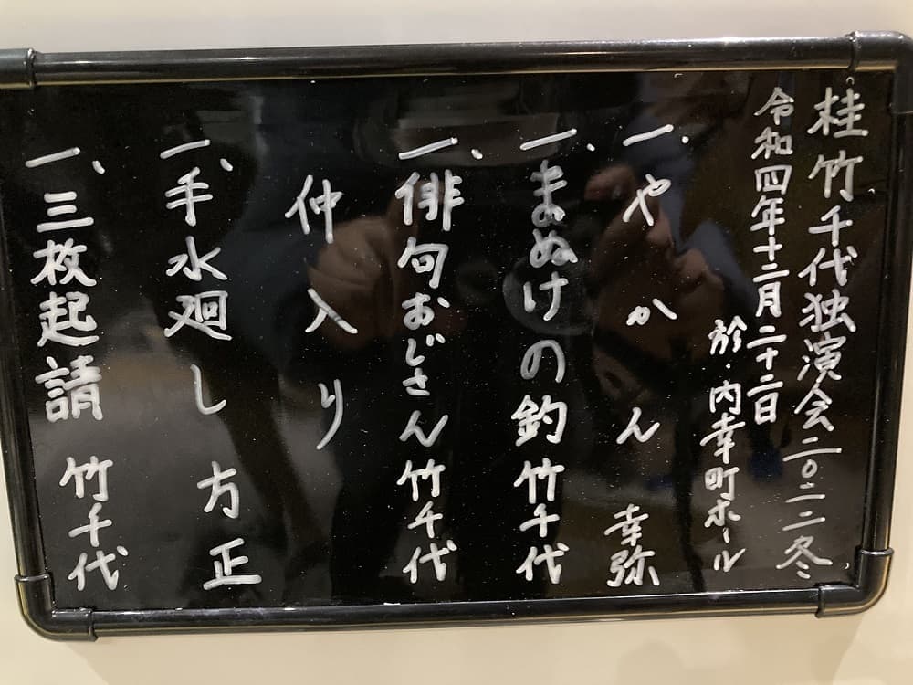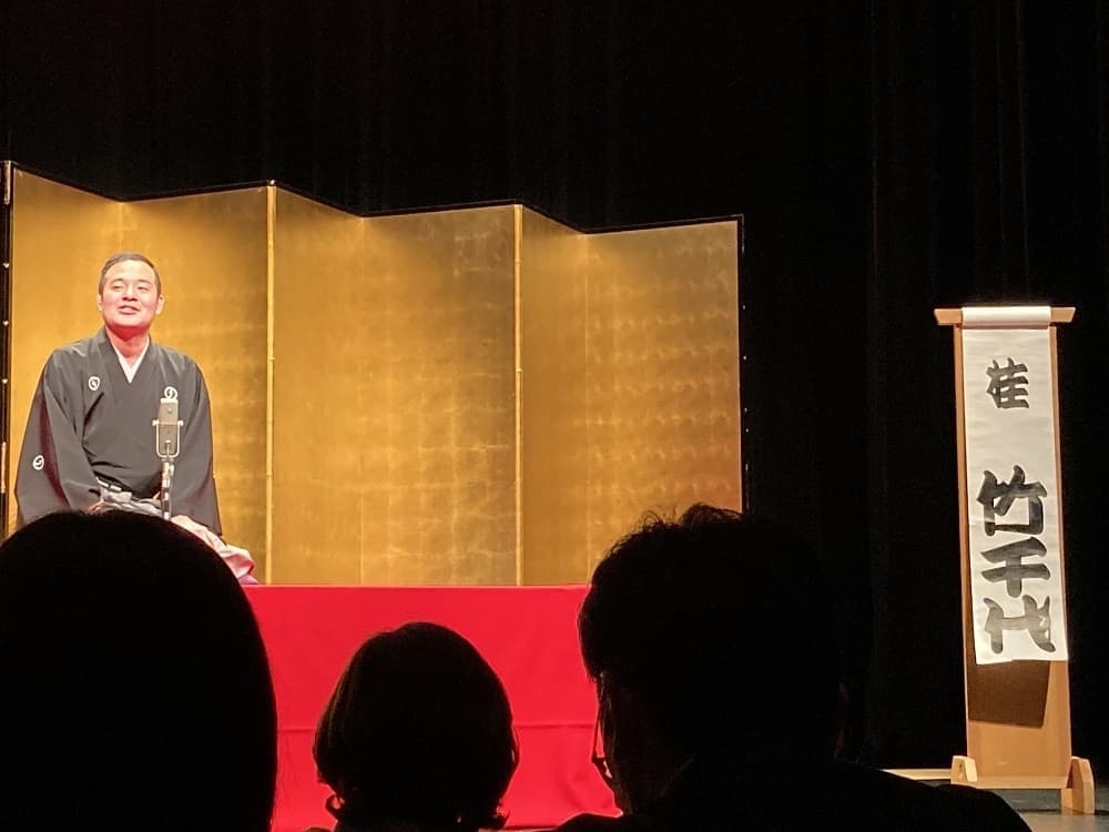 桂竹千代独演会に娘と出掛けてきました。竹丸師匠には竹丸一門の後援会、本格活動開始の報告と手ぬぐいをお渡ししました。