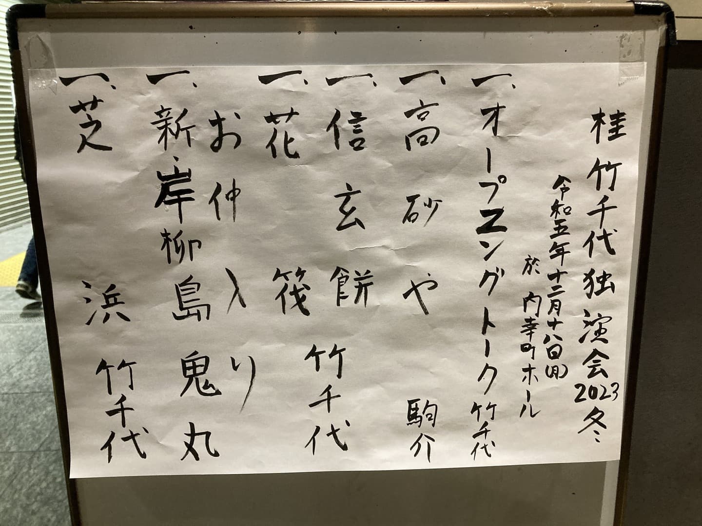 一、短命 笹丸 以上です。 画像は、会場入り口から緞帳経由 前座名の竹わと二つ目の笹丸さんの画像です。一門会HPへの反映をお願いします