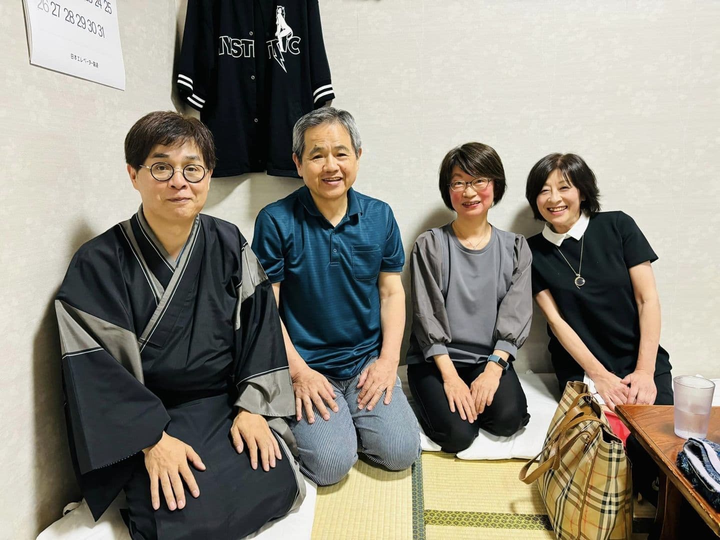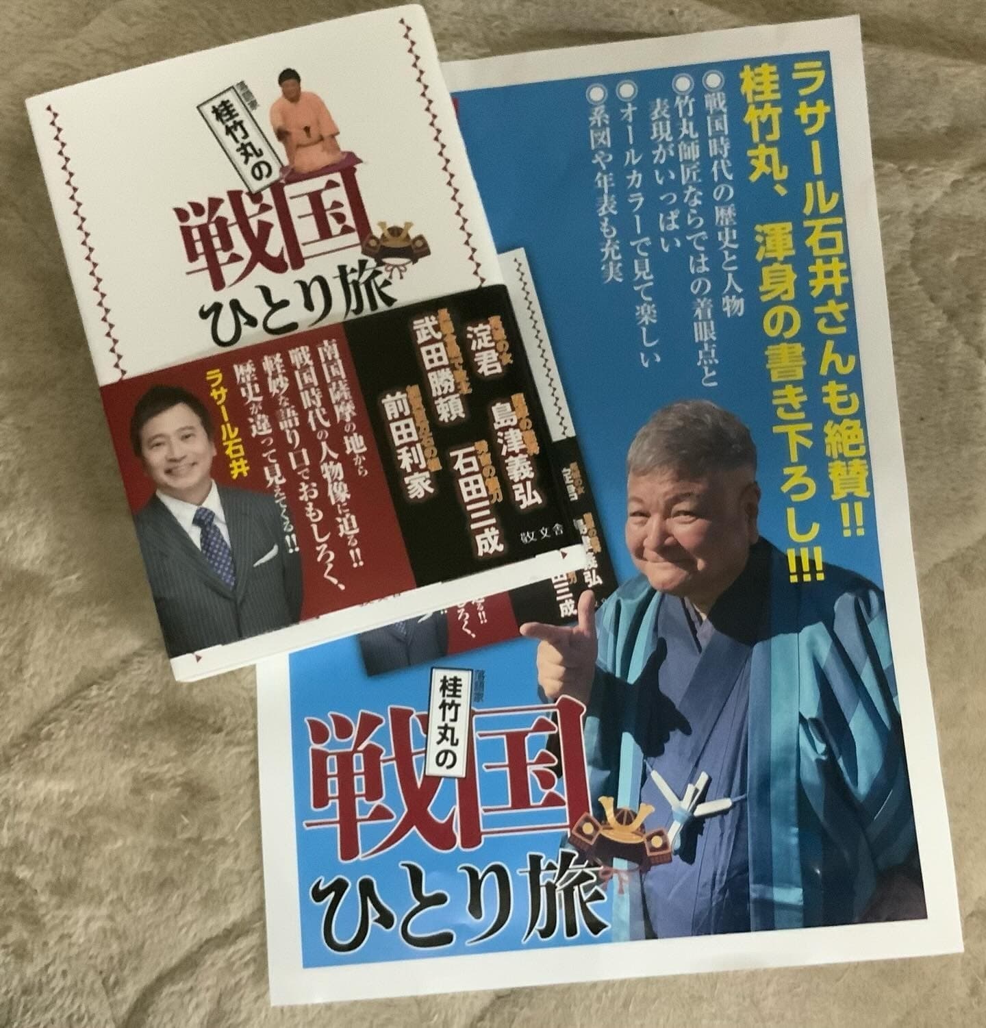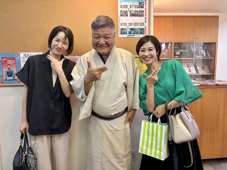 手ぬぐいを持って私服での師匠の写真かわいらしいですね。後援会会員で手ぬぐいリレーやると面白いかもですね。(江藤昭子 8/17FBより)