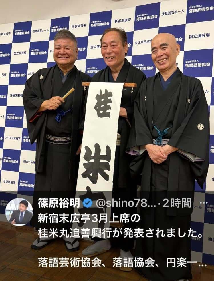 2025年9月26日 終戦80年の本年に創作落語「特攻セズ」多くのメディアに取り上げられた最高傑作噺です。嬉しい事に、来る10月9日(木)に生で聴けますよ\(^o^)/場所:お江戸上野広小路亭 しのばず寄席日時:2025年10月9日(木) 13:50あがり 約30分 お仲入り前の時間帯の様です。木戸銭:予約料金:@2.000 当日料金:@2.500 生(ライブ)での高座観賞が未だの方も、既に拝聴なさった方もその進化度(噺の中身)に、改めてご注目下さいませ。当席は、70名程度の凝縮された会場で、より深い噺が聴そうですよ 沢山の桂竹丸後援会会員の皆様のご来場をお待ちしております。私は、友人達と当日の開口一番から拝聴する予定にしてます。